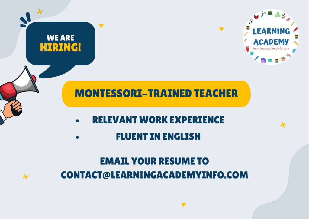 Montessori trained teachers with fluent English may email their resume to contact@learningacademyinfo.com for available opportunities. If we do not have an opening available, we will keep your resume in file for future openings.